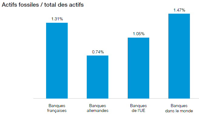 Les six banques françaises comprises dans cette étude – BNP Paribas, Crédit Agricole, Société Générale, BPCE / Natixis, Crédit Mutuel et La Banque Postale – ont un niveau global d’exposition aux énergies fossiles similaire à la moyenne mondiale mais supérieur à la moyenne européenne. À elles toutes, ces banques possèdent 125 milliards d’euros d’actifs fossiles dans leurs bilans, soit 1,31 % du total de leurs actifs, contre une moyenne de 1,05 % dans l’UE et de 1,47 % à l’échelle mondiale.